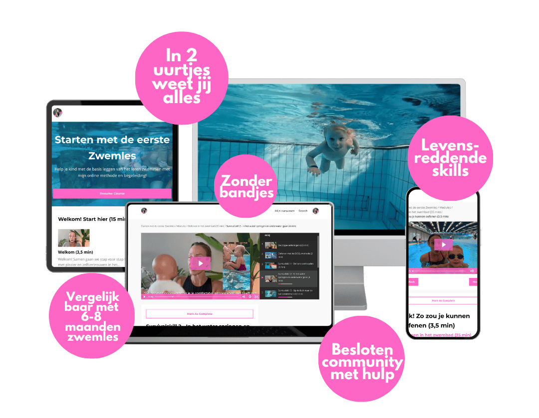 Ik leer je in een aantal korte video's hoe jij zelf de eerste zwemlessen aan je kind geeft. Waarmee jouw kind zichzelf kan leren redden zonder drijfmiddelen. Zodat jij met plezier en een gerust hart aan de rand van het zwembad kunt zitten, kijkend naar je kind dat volop geniet van het water en de basis heeft om een schoolslag te leren.