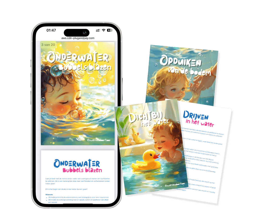 Elke dag 1 mini-stap die je kind helpt om water te vertrouwen. Zonder tranen of druk, zonder “kom op, niet huilen”. Want watervrij worden begint niet met oefenen, maar met ontspannen