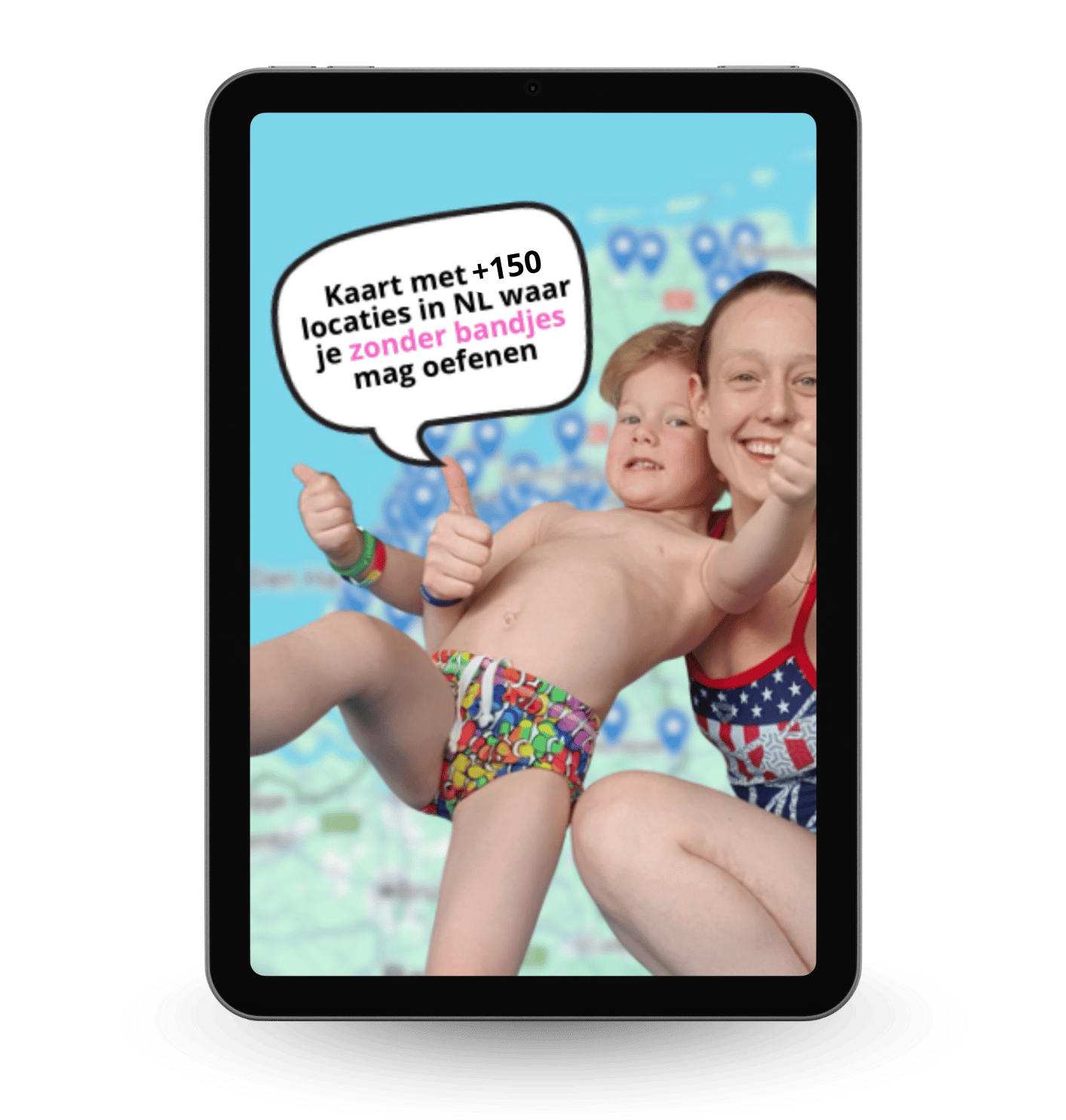 Je krijgt toegang tot een kaart met +130 zwembaden in Nederland waar je mag oefenen zonder bandjes, zodat je vanaf moment 1 je kind leert vertrouwen op het eigen lijf, in plaats van een extern hulpmiddel).
