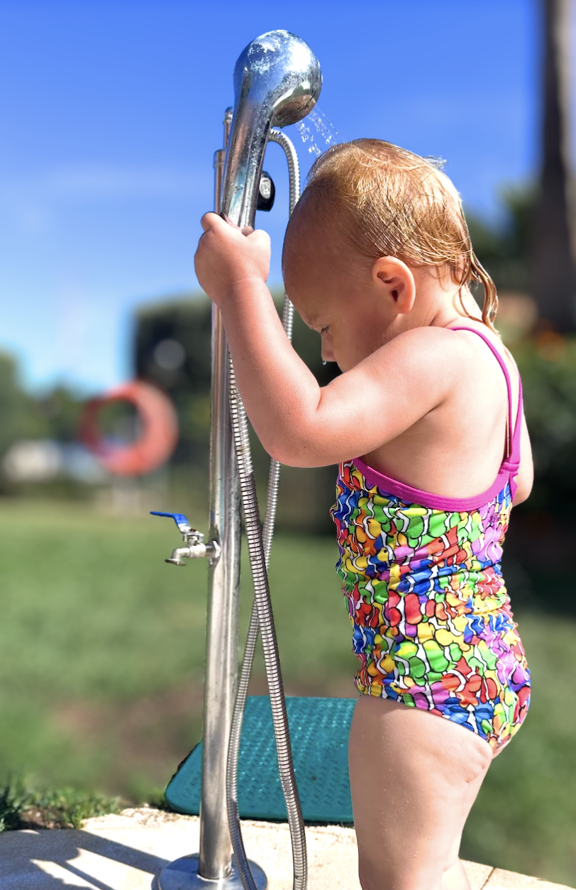 Yes! Misschien zelfs nog beter dan alleen in bad ;-) Want in bad is een kind erg geneigd er alles aan te doen hoofd bovenwater te houden, onder de douche zijn er constant spetters en kun je 'sturen' met het water omdat je de douchekop kan (laten) vasthouden.